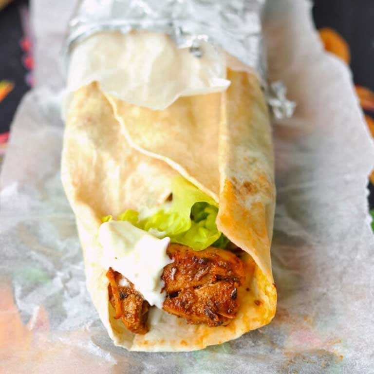Chicken Shish Kebab Roll: Grilled, tender chicken shish kebab wrapped in soft flatbread, with fresh salad and flavorful sauces for a delicious, satisfying bite.